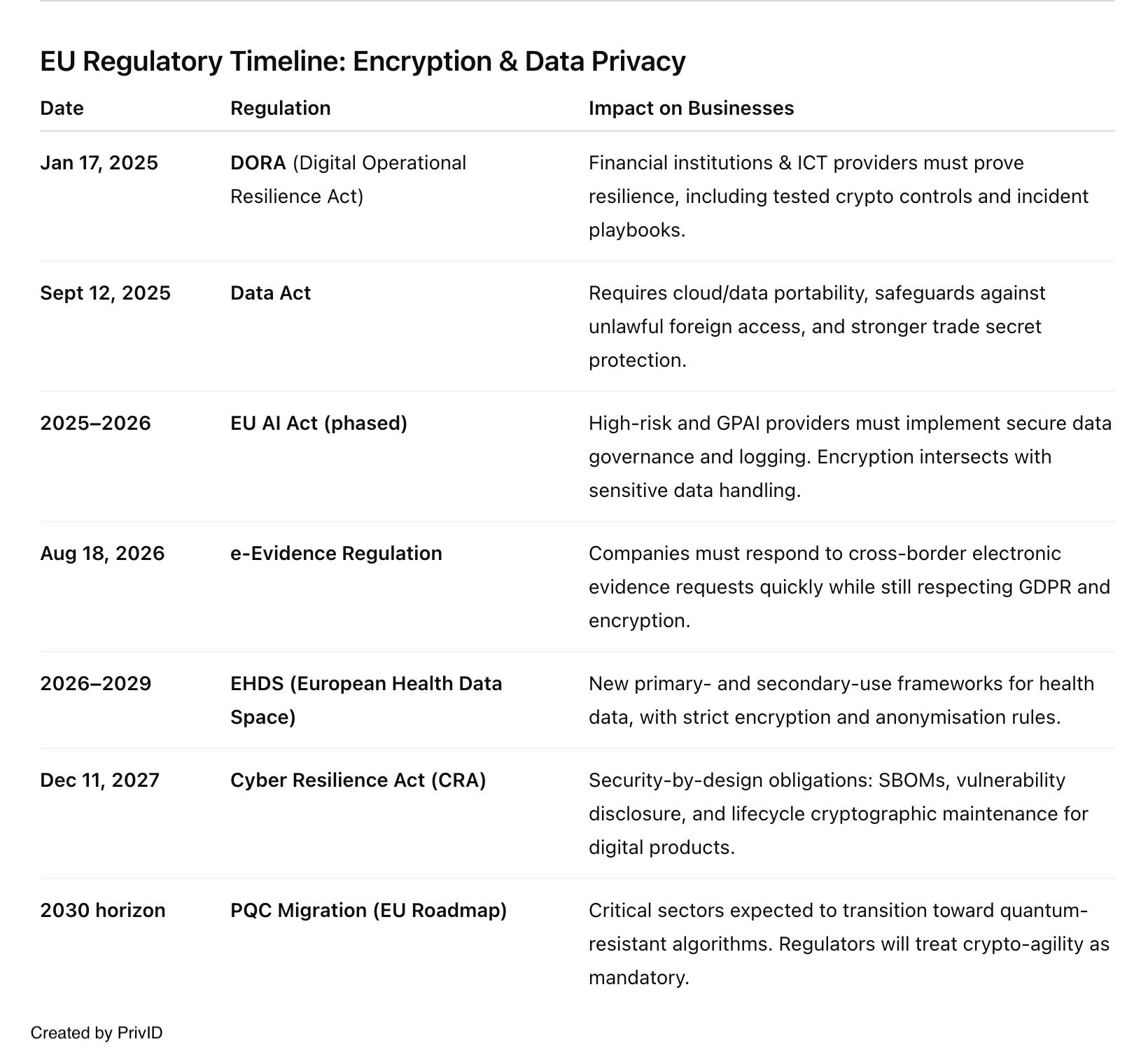 At the same time, the EU is rolling out a regulatory landscape that demands stronger, not weaker, cryptography. Here’s where businesses need to pay attention: